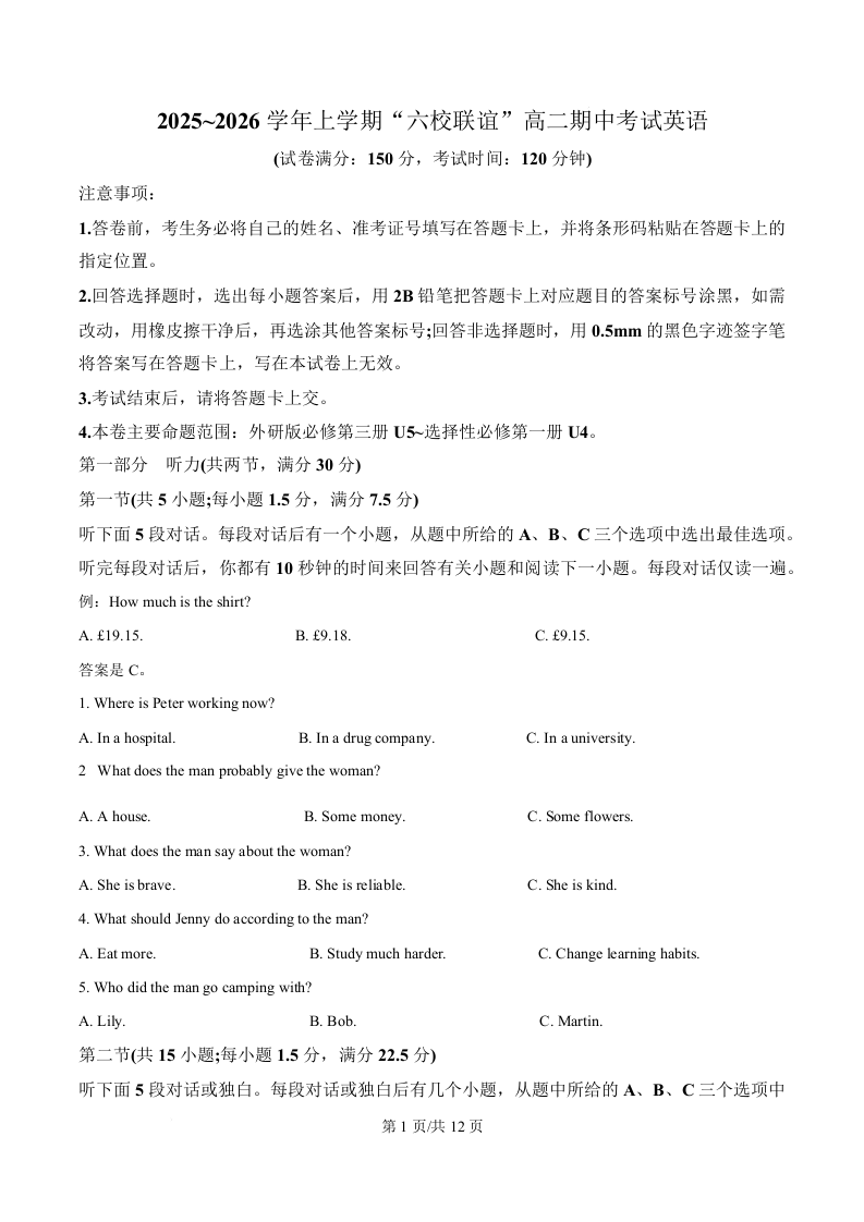 高二英语(原卷版)--黑龙江省齐齐哈尔六校联谊2025-2026学年高二上学期11月期中考试