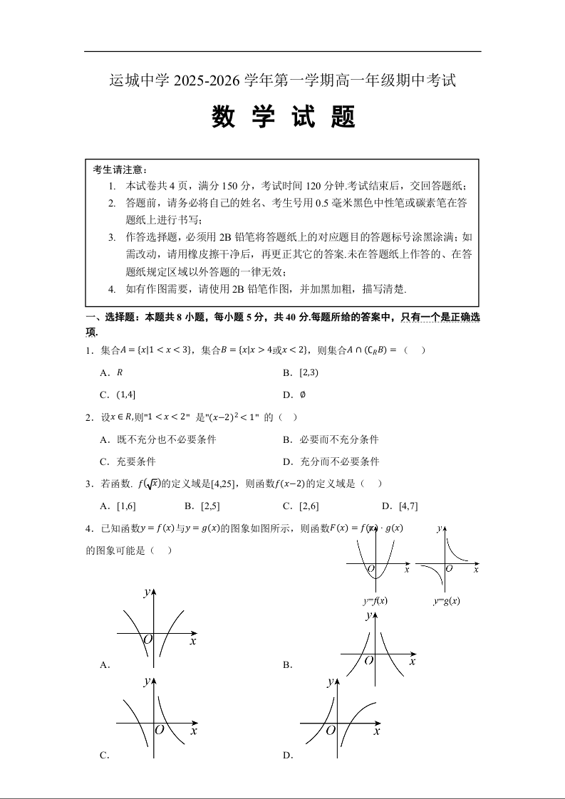 高一数学--山西省运城市运城中学2025-2026学年高一上学期11月期中考试