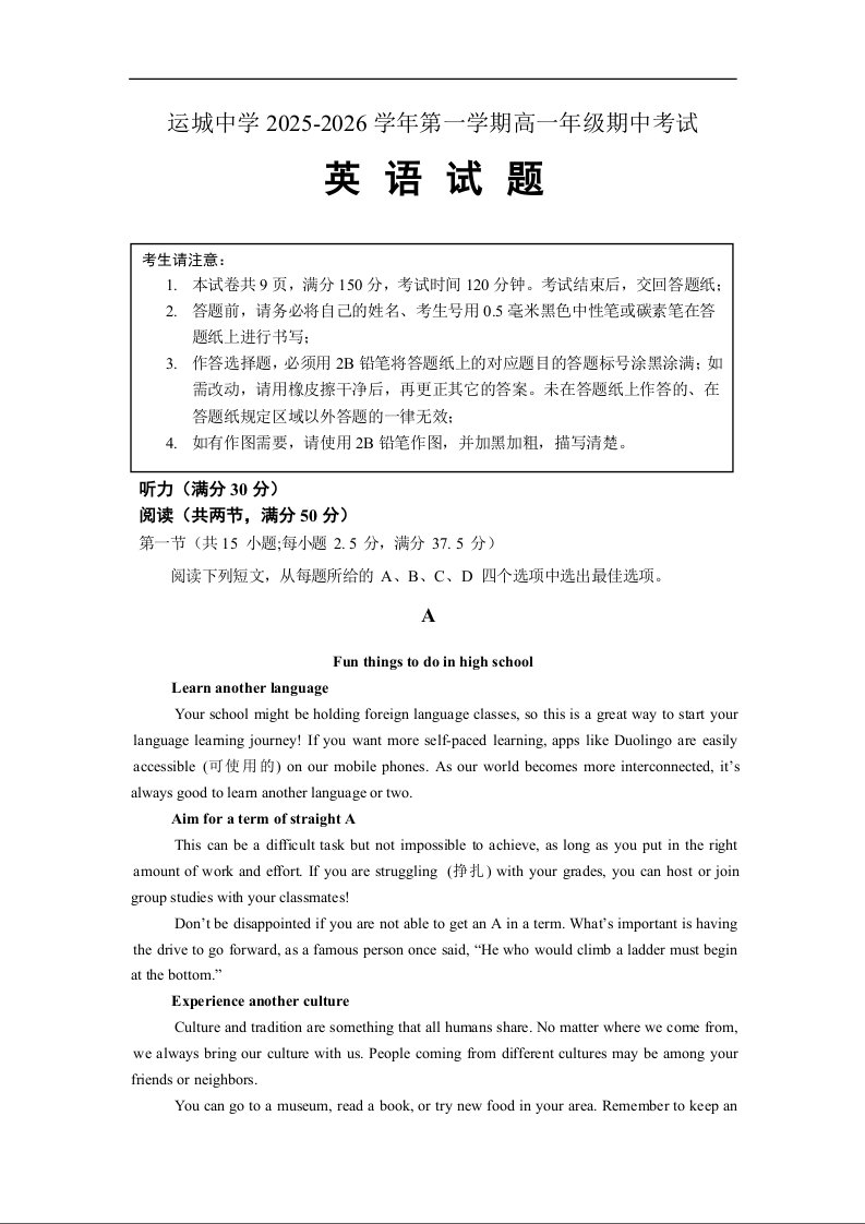 高一英语--山西省运城市运城中学2025-2026学年高一上学期11月期中考试