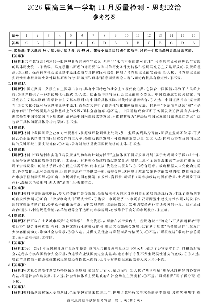高三政治答案--安徽省华师联盟2026届高三第一学期11月质量检测