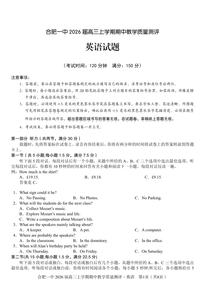 高三英语+答案--安徽省合肥一中2026届高三上学期11月期中教学质量检测