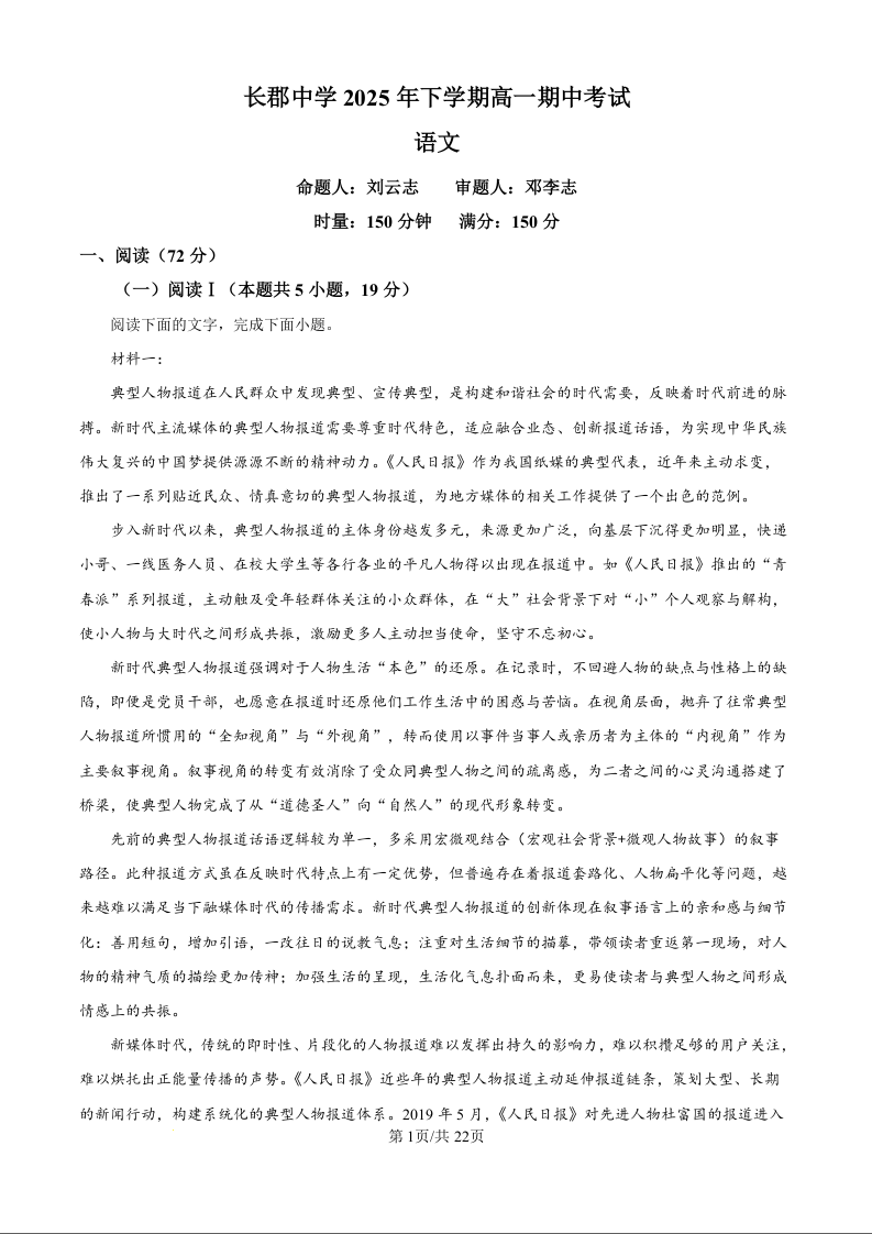 高一语文(精品解析版)--湖南省长沙市长郡中学2025-2026学年高一上学期期中考试