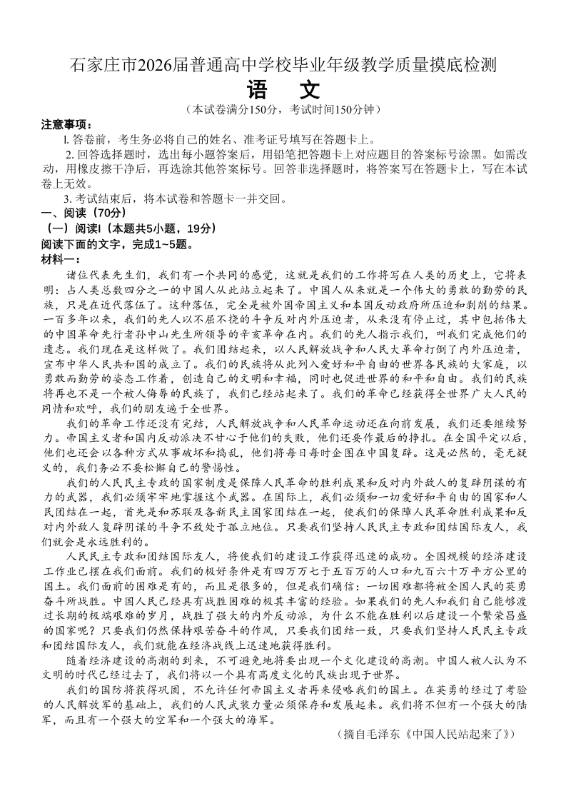 高三语文--河北省石家庄市2026届高三上学期11月教学质量摸底检测