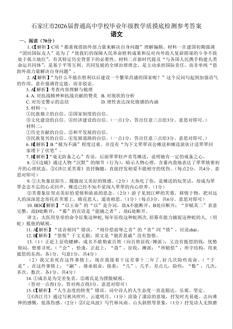 高三语文答案--河北省石家庄市2026届高三上学期11月教学质量摸底检测