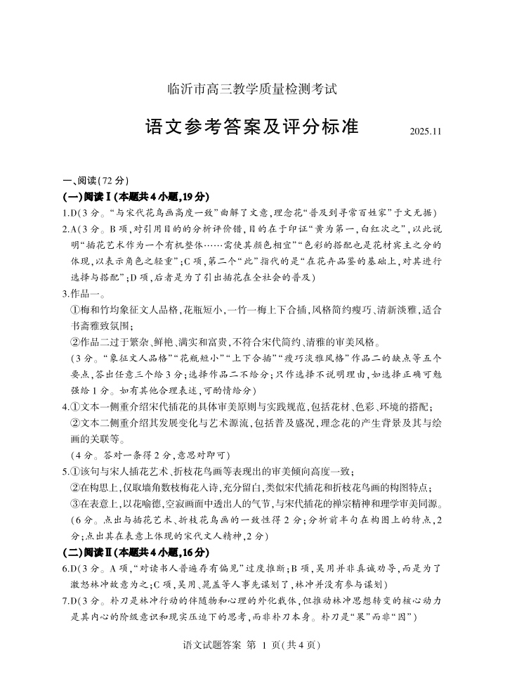 高三语文答案--山东省临沂市2026届高三11月教学质量检测