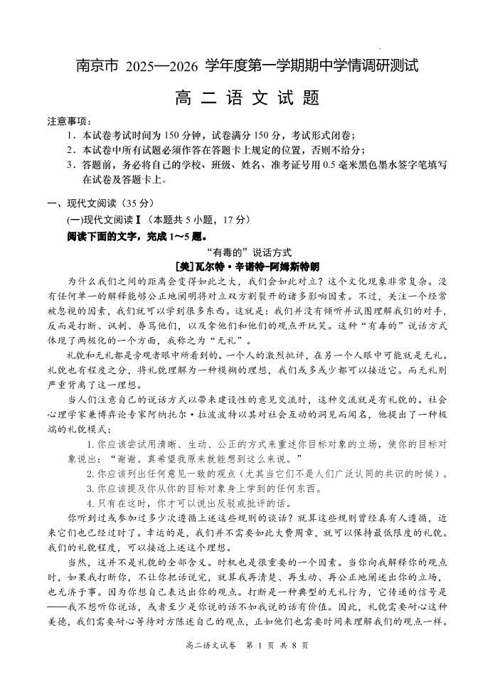 高一语文+答案--江苏省南京市2025-2026学年高二上学期期中学情调研测试