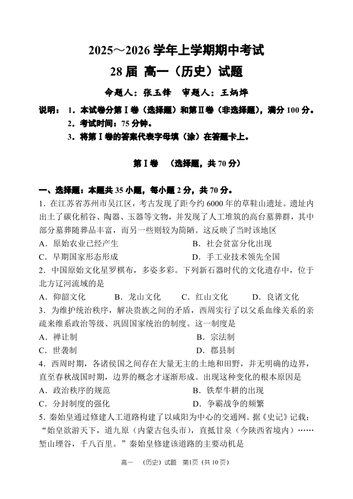 高一历史+答案--河南省郑州市第一中学2025~2026学年高一上学期期中考试