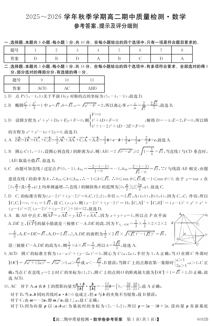 高二数学答案--安徽省华师联盟2025~2026学年秋季学期高二期中质量检测