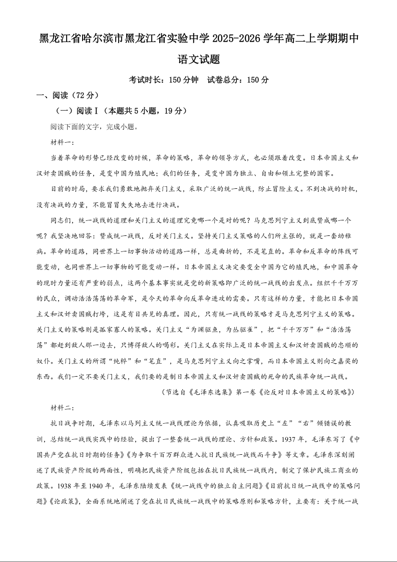 高二语文(解析版)--黑龙江省哈尔滨市省实验中学2025-2026学年高二上学期期中