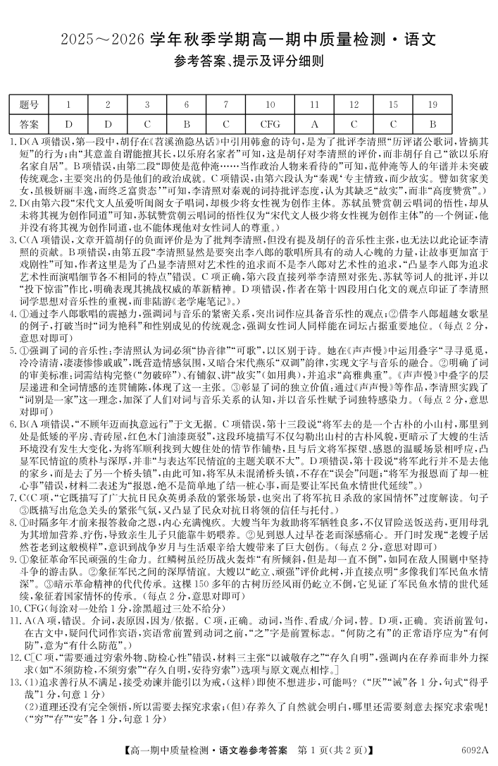 高一语文答案--安徽省华师联盟2025~2026学年秋季学期高一期中质量检测