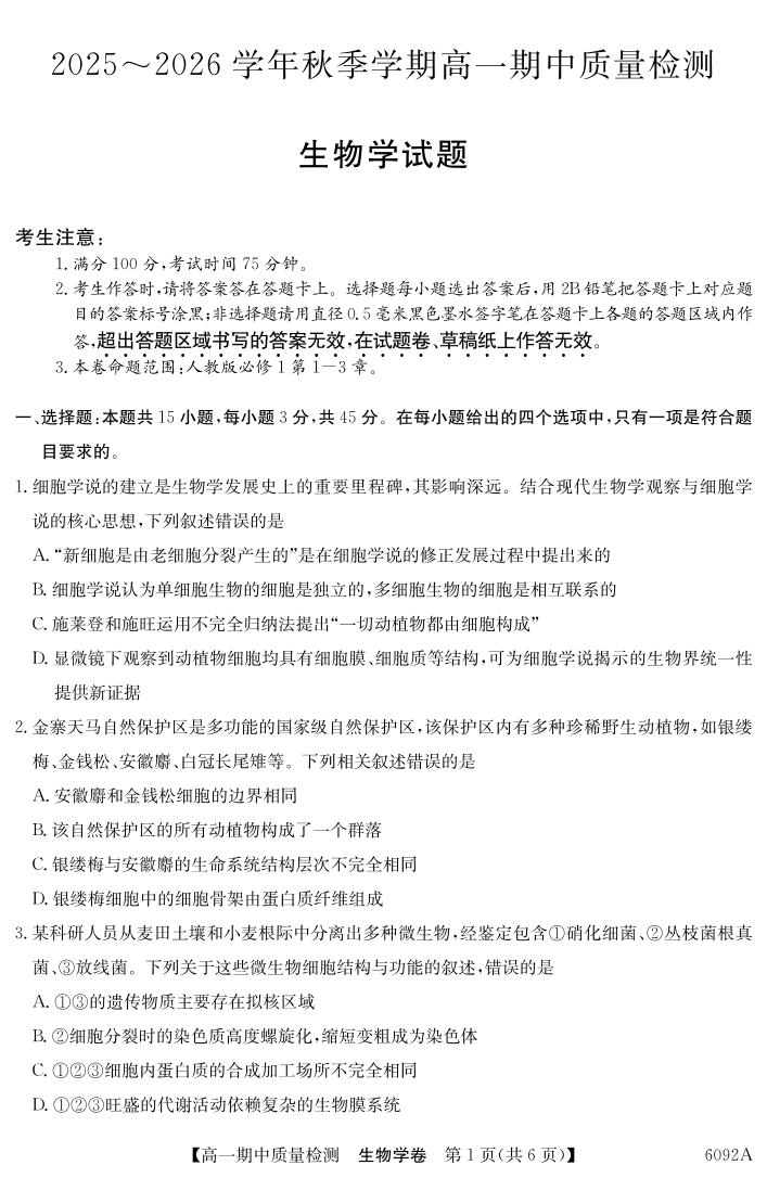 高一生物--安徽省华师联盟2025~2026学年秋季学期高一期中质量检测