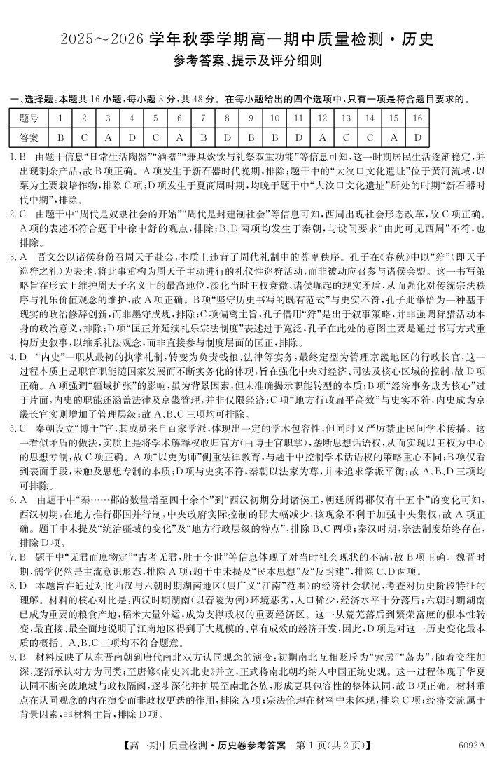 高一历史答案--安徽省华师联盟2025~2026学年秋季学期高一期中质量检测