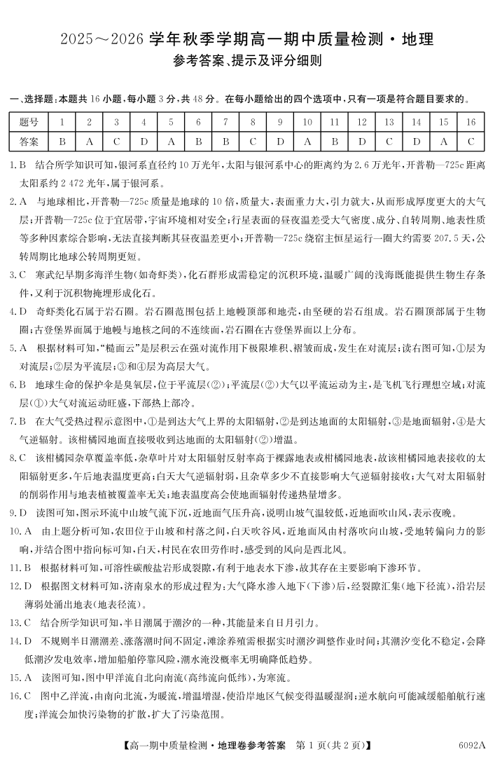 高一地理答案--安徽省华师联盟2025~2026学年秋季学期高一期中质量检测