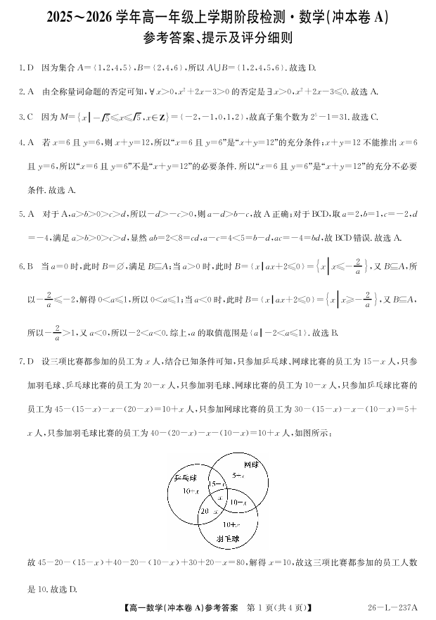 高一数学答案(冲本卷A)--安徽省江淮名校2025-2026学年高一上学期阶段联考
