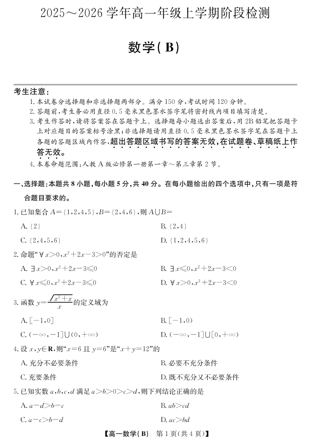 高一数学(冲本卷B)--安徽省江淮名校2025-2026学年高一上学期阶段联考