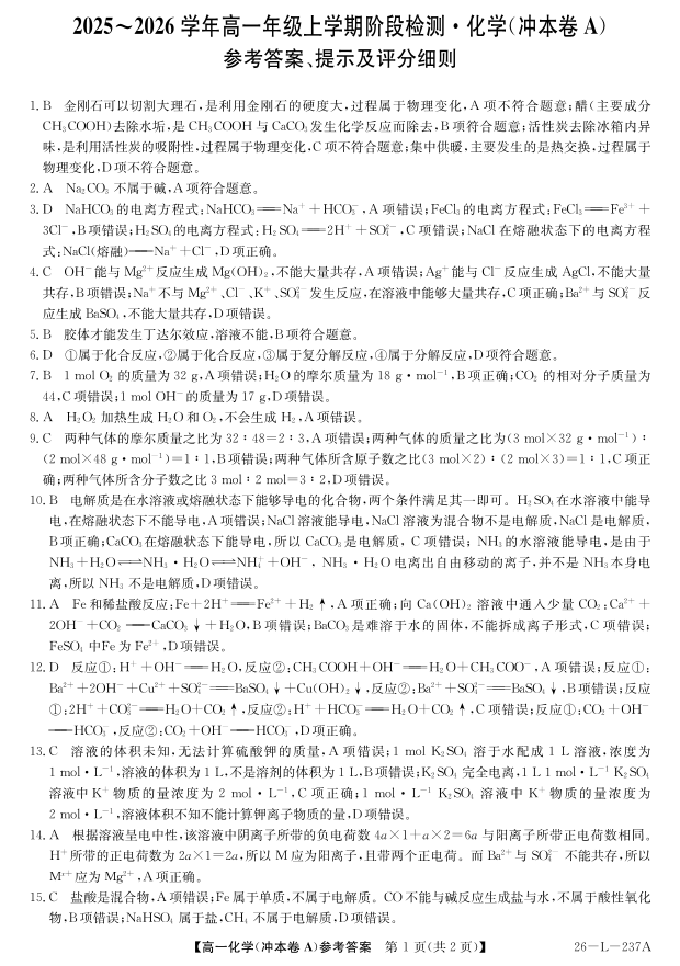 高一化学答案(冲本A)--安徽省江淮名校2025-2026学年高一上学期阶段联考