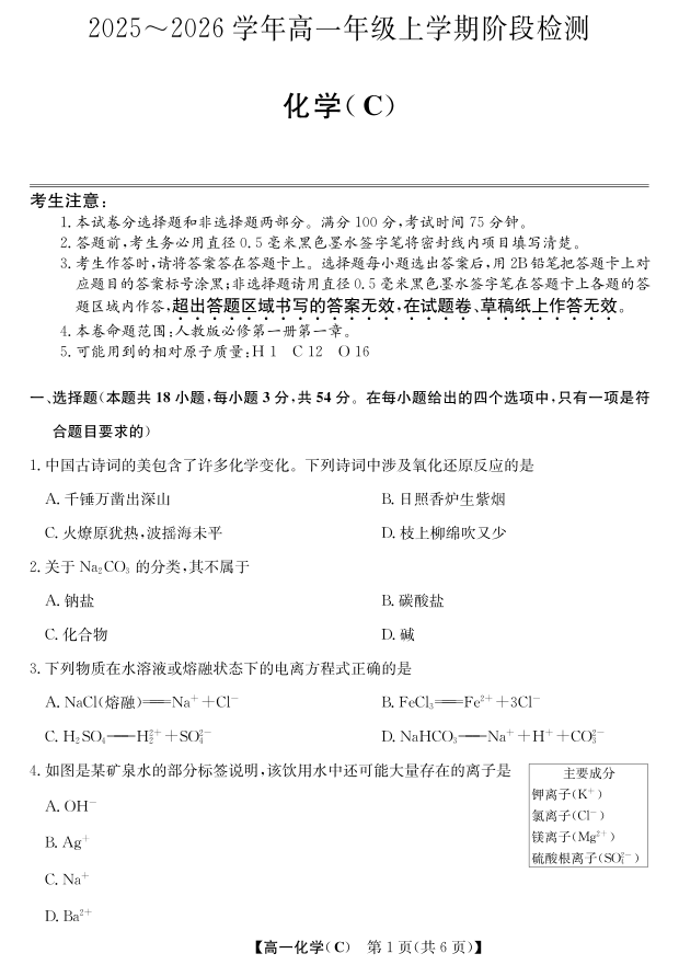 高一化学(冲本C)--安徽省江淮名校2025-2026学年高一上学期阶段联考