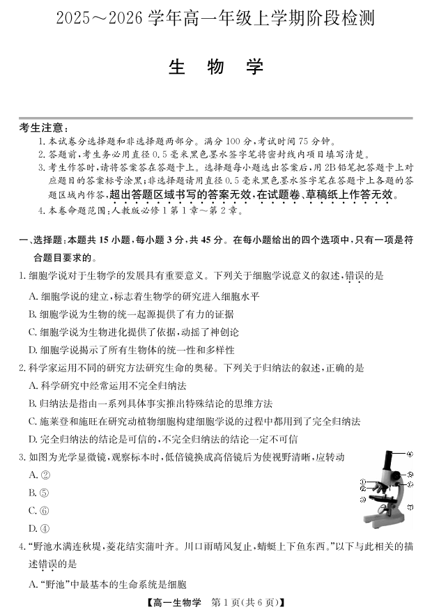 高一生物--安徽省江淮名校2025-2026学年高一上学期阶段联考