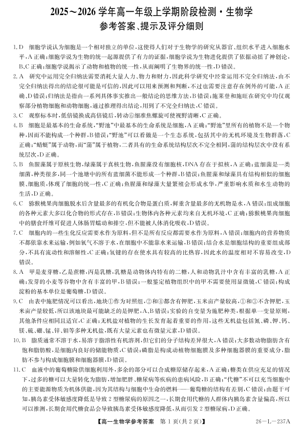 高一生物答案--安徽省江淮名校2025-2026学年高一上学期阶段联考