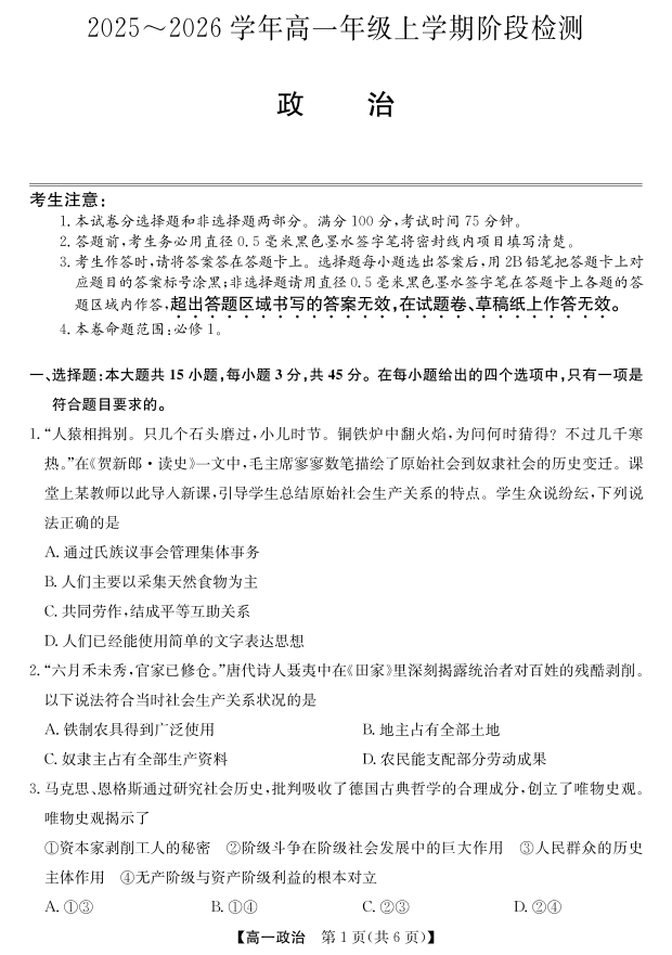 高一政治--安徽省江淮名校2025-2026学年高一上学期阶段联考