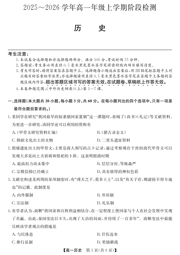 高一历史--安徽省江淮名校2025-2026学年高一上学期阶段联考
