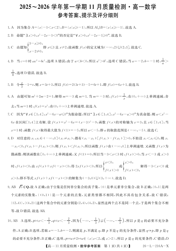 高一数学答案--安徽省县中联盟2025-2026学年第一学期高一期中考试