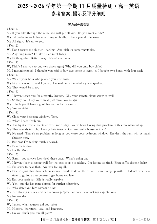高一英语答案--安徽省县中联盟2025-2026学年第一学期高一期中考试