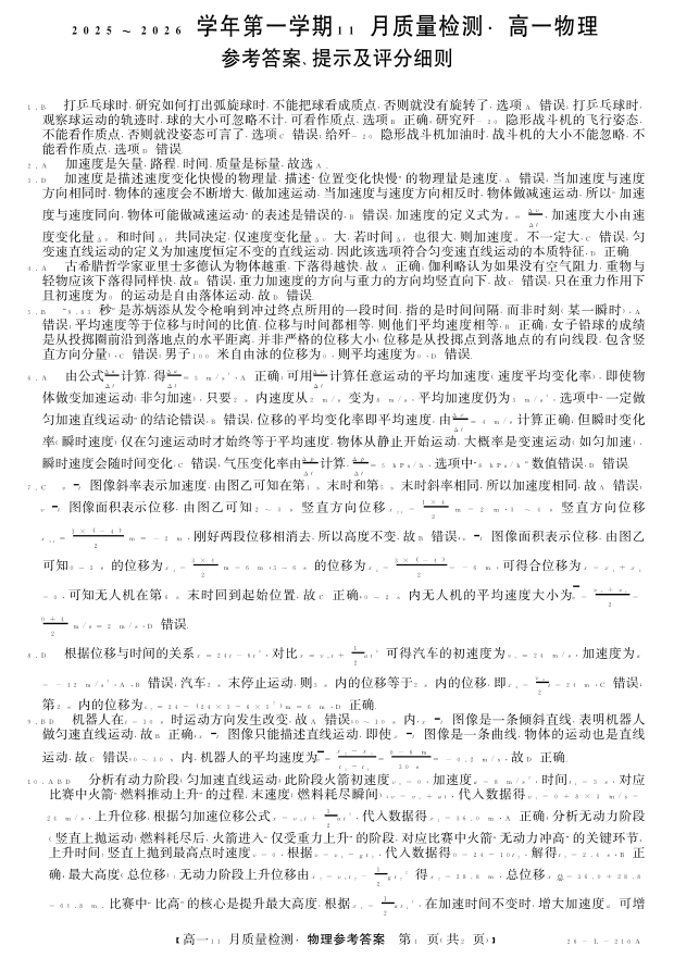 高一物理答案--安徽省县中联盟2025-2026学年第一学期高一期中考试