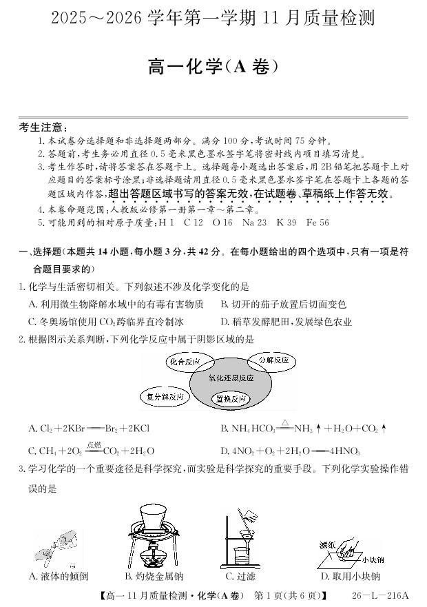 高一化学--安徽省县中联盟2025-2026学年第一学期高一期中考试