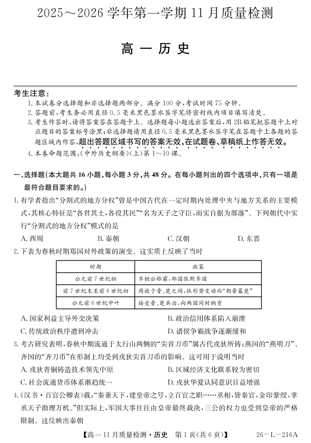 高一历史--安徽省县中联盟2025-2026学年第一学期高一期中考试