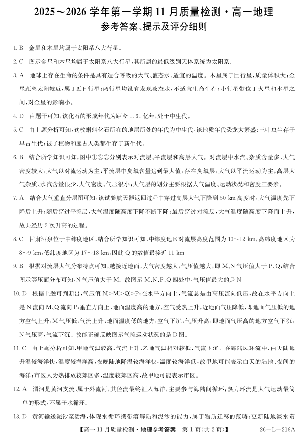 高一地理答案--安徽省县中联盟2025-2026学年第一学期高一期中考试