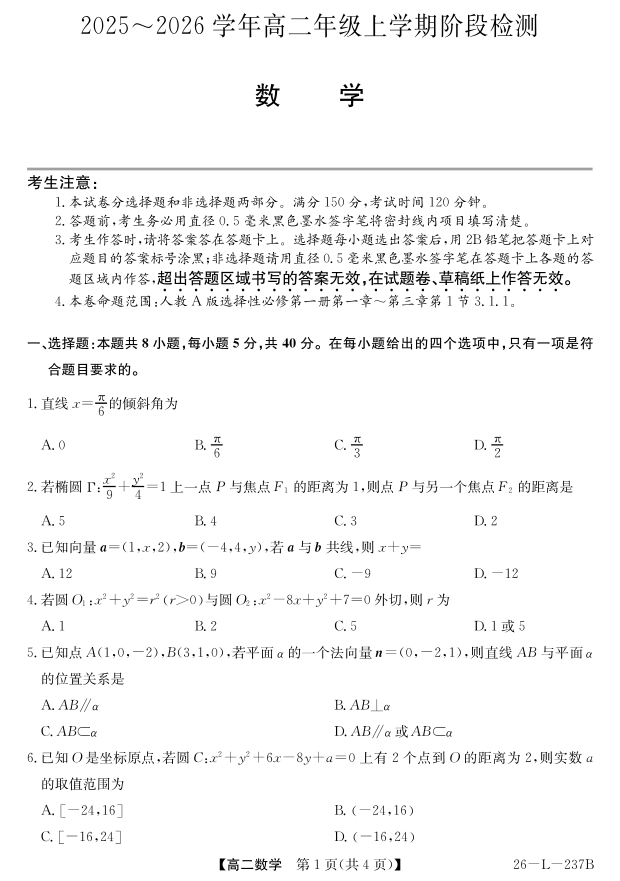 高二数学--安徽省江淮名校2025-2026学年高二上学期阶段联考