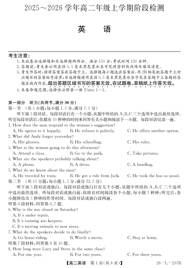 高二英语--安徽省江淮名校2025-2026学年高二上学期阶段联考