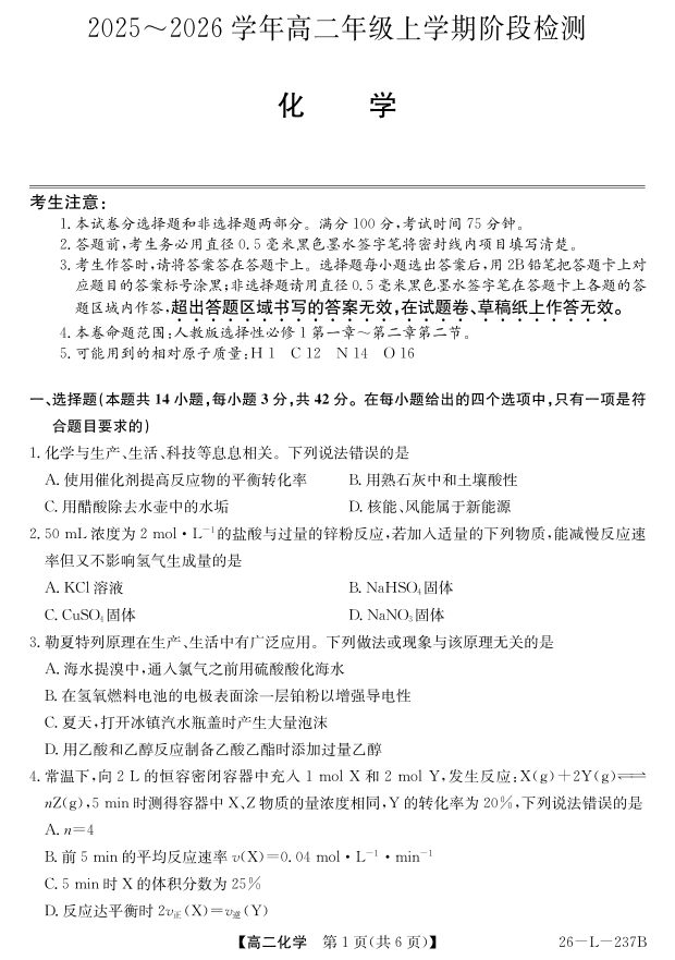 高二化学--安徽省江淮名校2025-2026学年高二上学期阶段联考