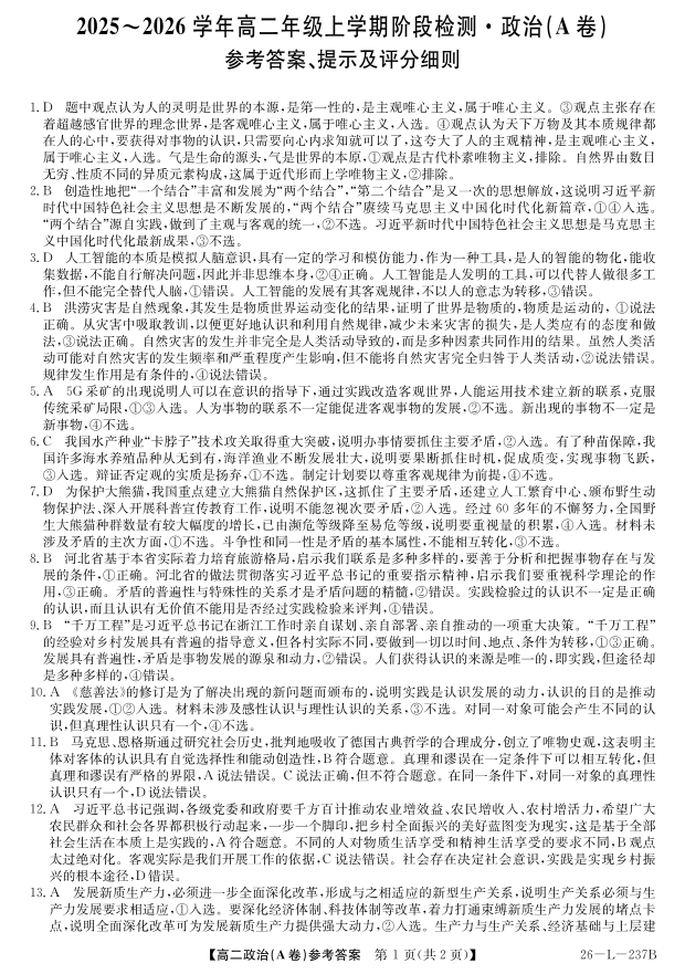 高二政治A卷答案--安徽省江淮名校2025-2026学年高二上学期阶段联考