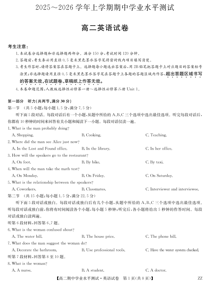 高二英语--河南省郑州市八校联盟2025-2026学年高二上学期11月期中考试
