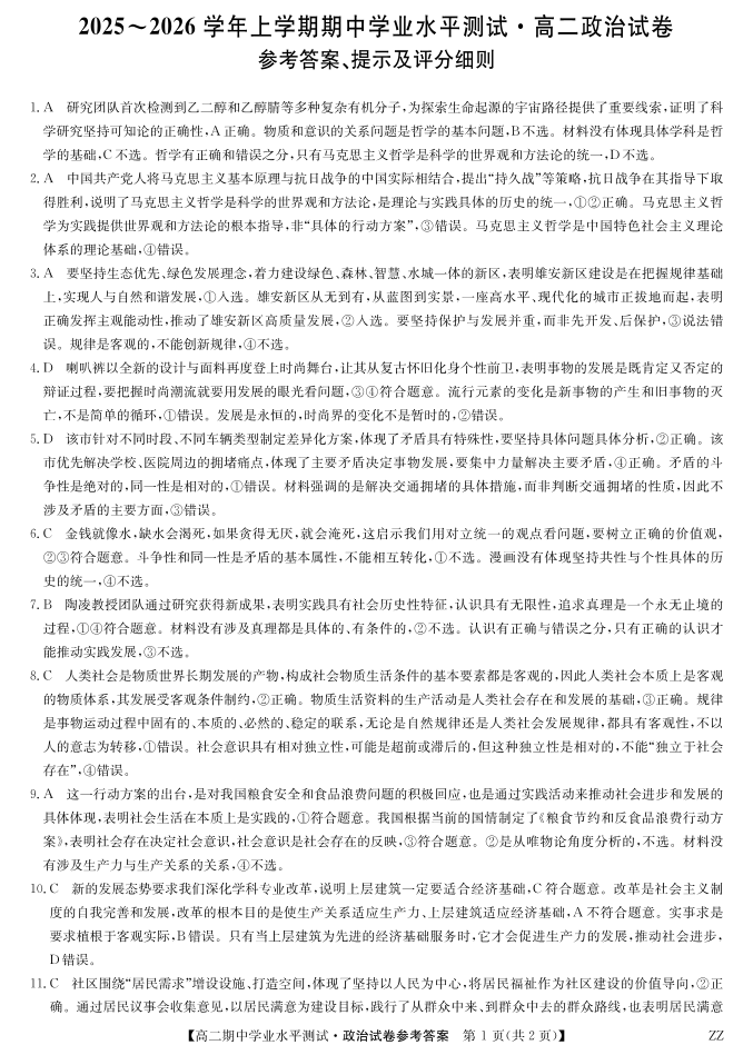 高二政治答案--河南省郑州市八校联盟2025-2026学年高二上学期11月期中考试