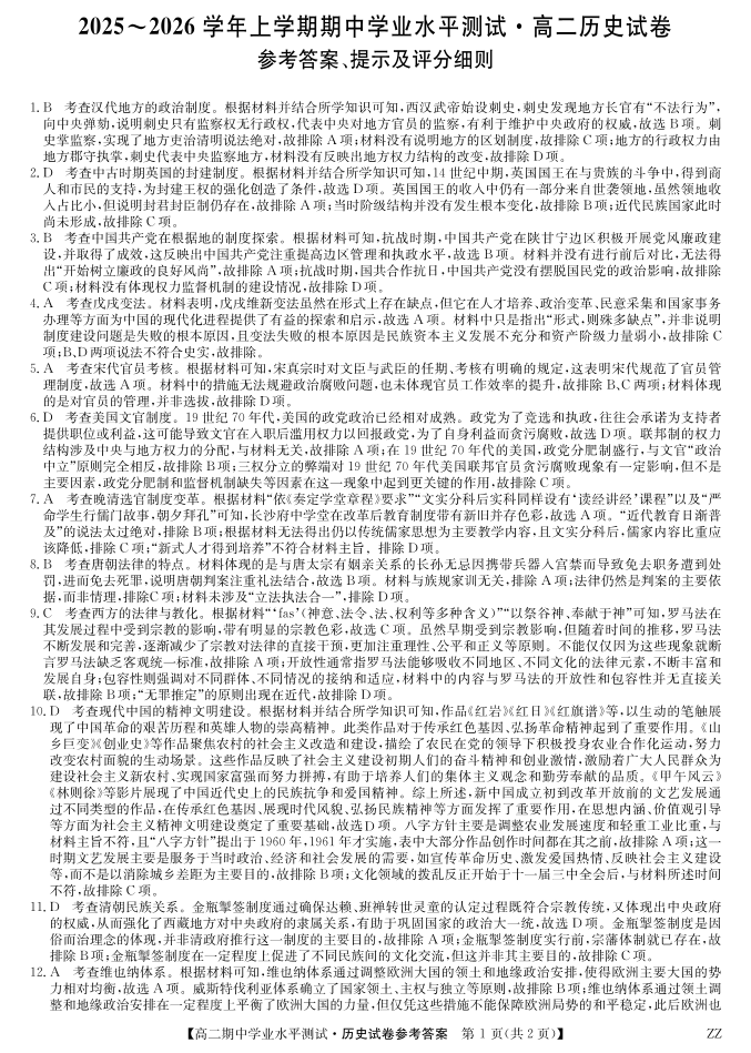 高二历史答案--河南省郑州市八校联盟2025-2026学年高二上学期11月期中考试