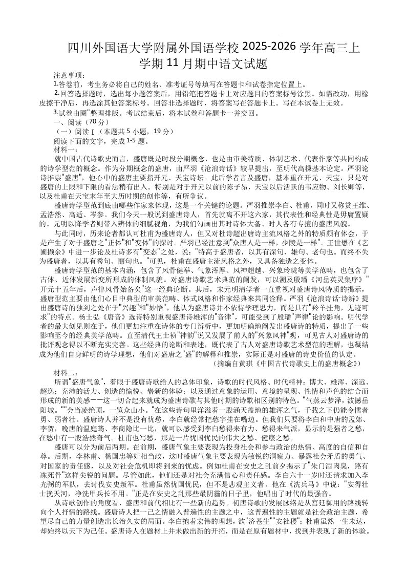 高三语文+答案--四川外国语大学附属外国语学校2026届高三上学期11月期中考试