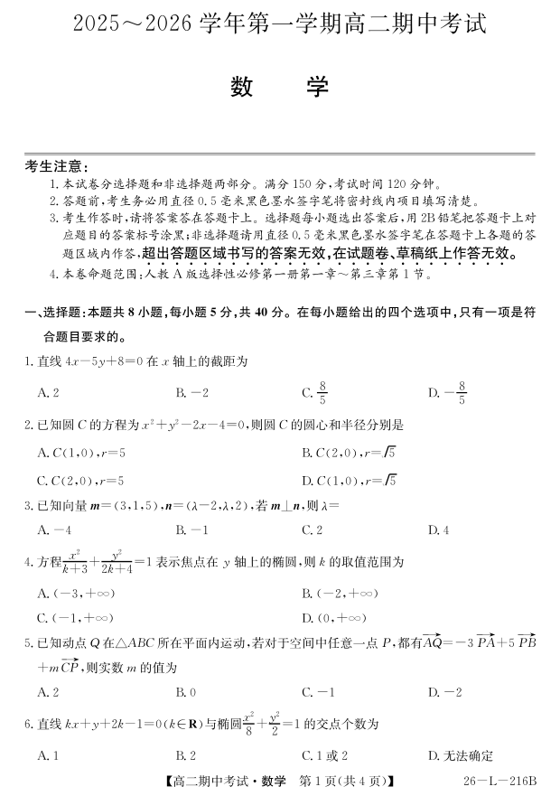 高二数学--安徽省县中联盟2025-2026学年第一学期高二期中考试(26-L-216B)