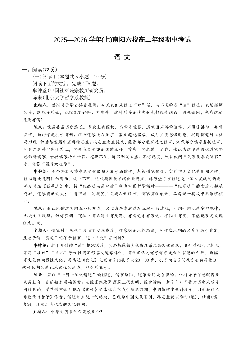 高二语文--河南省南阳市六校2025-2026学年高二上学期期中考试