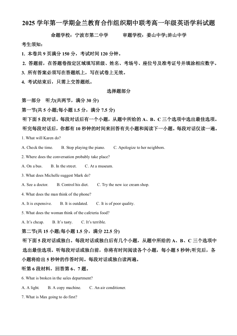 高一英语(解析版)--浙江省金兰教育合作组织2025-2026学年高一上学期期中考试