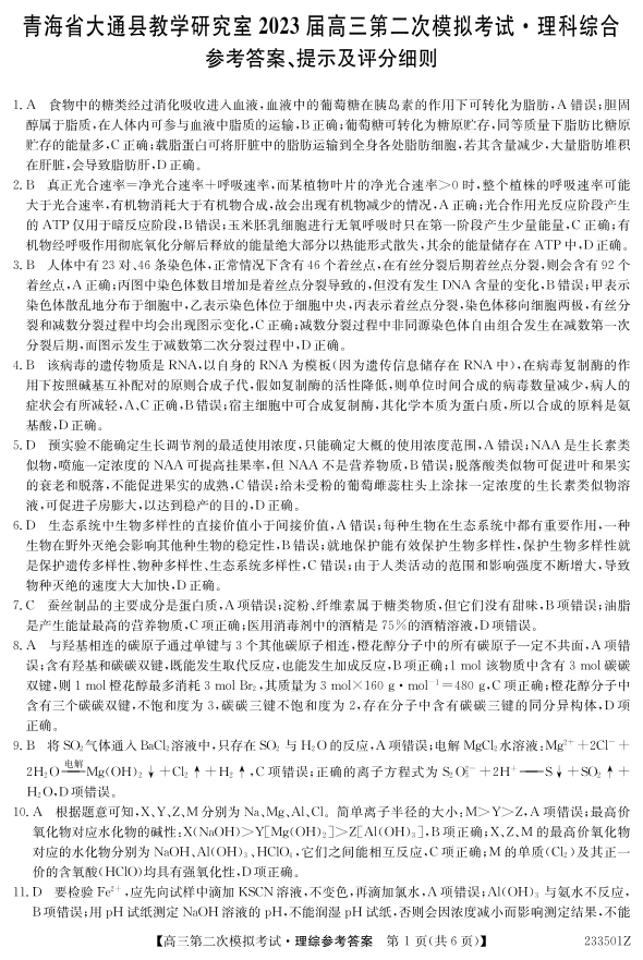 高三理综答案--青海省西宁市2023届高三二模