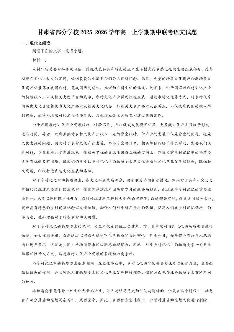 高一语文+答案--甘肃省部分学校2025-2026学年高一上学期阶段测试(二)