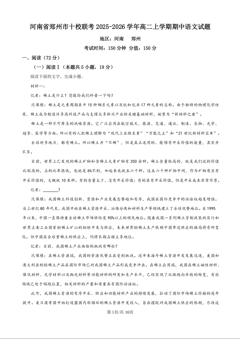 高二语文(原卷版)--河南省郑州市十校2025-2026学年高二上学期11月期中联考
