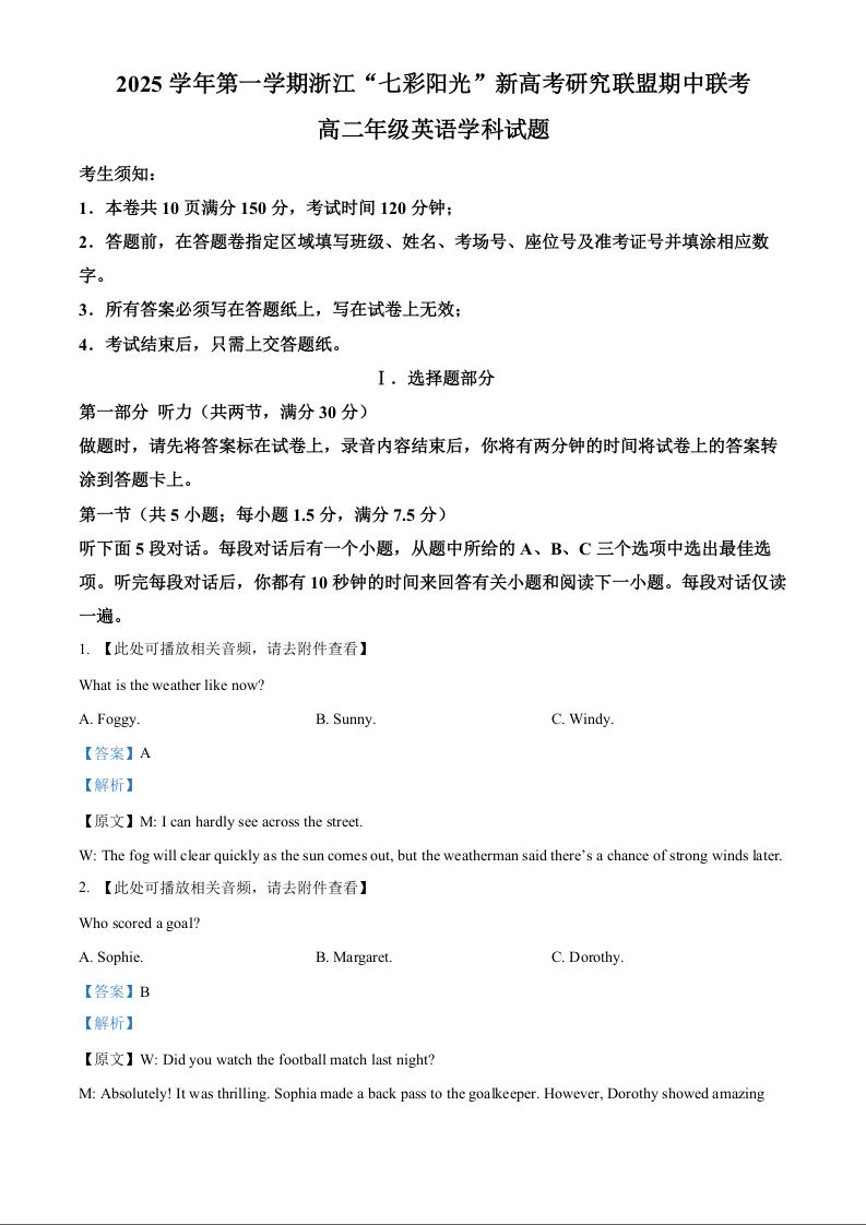 高二英语(解析版) --浙江省”七彩阳光“新高考研究联盟2025-2026学年高二上学期期中联考试