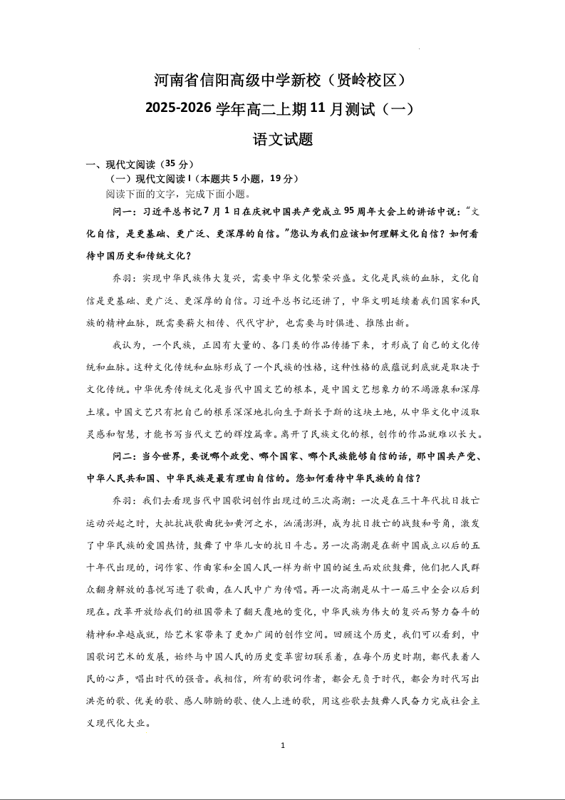 高二语文--河南省信阳高级中学2025-2026学年高二上学期11月月考