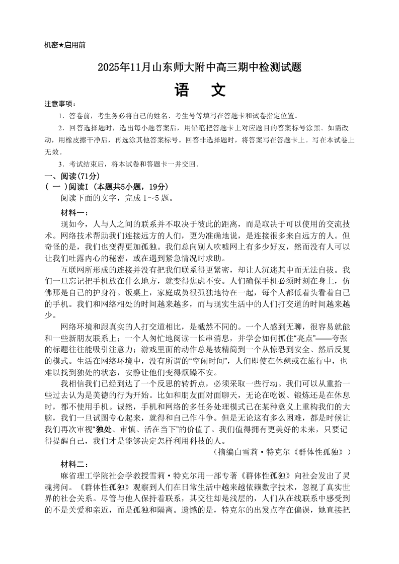 高三语文--山东师范大学附属中学2026届高三上学期11月期中考试