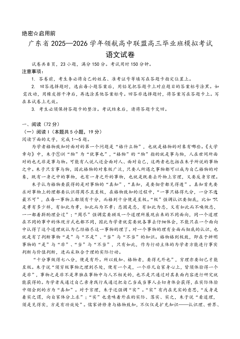 高三语文+答案--广东省2026届领航高中联盟高三毕业班模拟考试