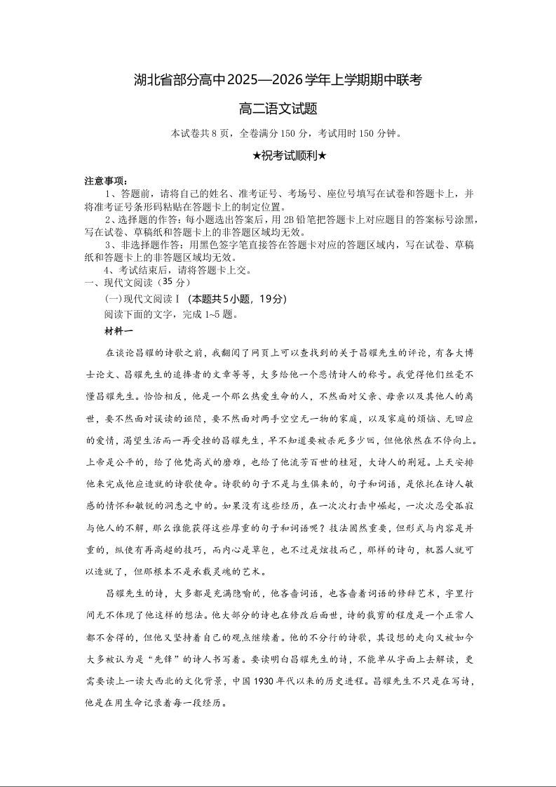 高二语文答案--湖北省部分高中联考2025-2026学年高二上学期11月期中